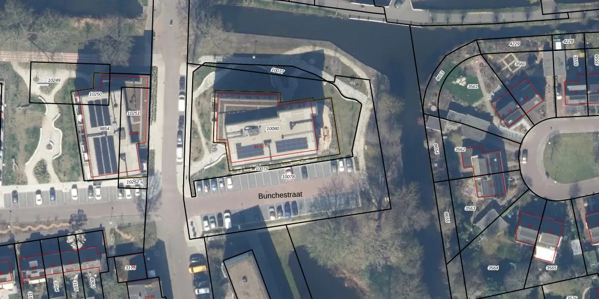 Bunchestraat 65 is gelegen op kadastraal perceel GDA01K10080. Deze kadastrale aanduiding is uniek en wordt gebruikt door het Kadaster om eigendomsrechten en andere zakelijke rechten vast te leggen. Het perceel maakt onderdeel uit van de kadastrale gemeente Gouda.