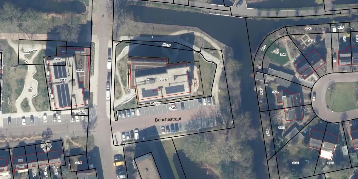 Bunchestraat 77 is gelegen op kadastraal perceel GDA01K10080. Deze kadastrale aanduiding is uniek en wordt gebruikt door het Kadaster om eigendomsrechten en andere zakelijke rechten vast te leggen. Het perceel maakt onderdeel uit van de kadastrale gemeente Gouda.