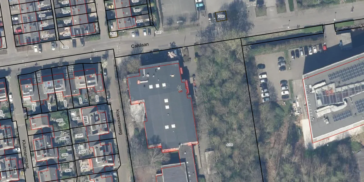 Het perceel waarop Calslaan 100 staat heeft een oppervlakte van 7261 m². Dit is een zeer groot perceel. De perceeloppervlakte wordt geregistreerd door het Kadaster. Gedetailleerde informatie over de maten van dit perceel kunt u vinden in het rapport Kadastrale kaart met maatvoering van Calslaan 100.