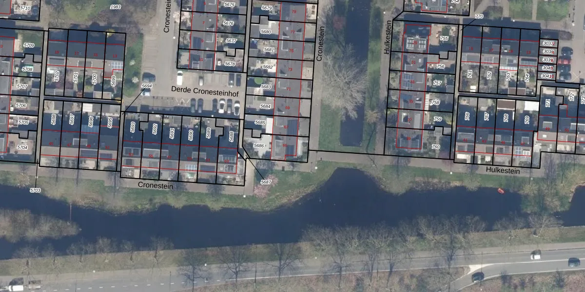 Het perceel waarop Cronestein 65 staat heeft een oppervlakte van 191 m². Dit is een middelgroot perceel. De perceeloppervlakte wordt geregistreerd door het Kadaster. Gedetailleerde informatie over de maten van dit perceel kunt u vinden in het rapport Kadastrale kaart met maatvoering van Cronestein 65.
