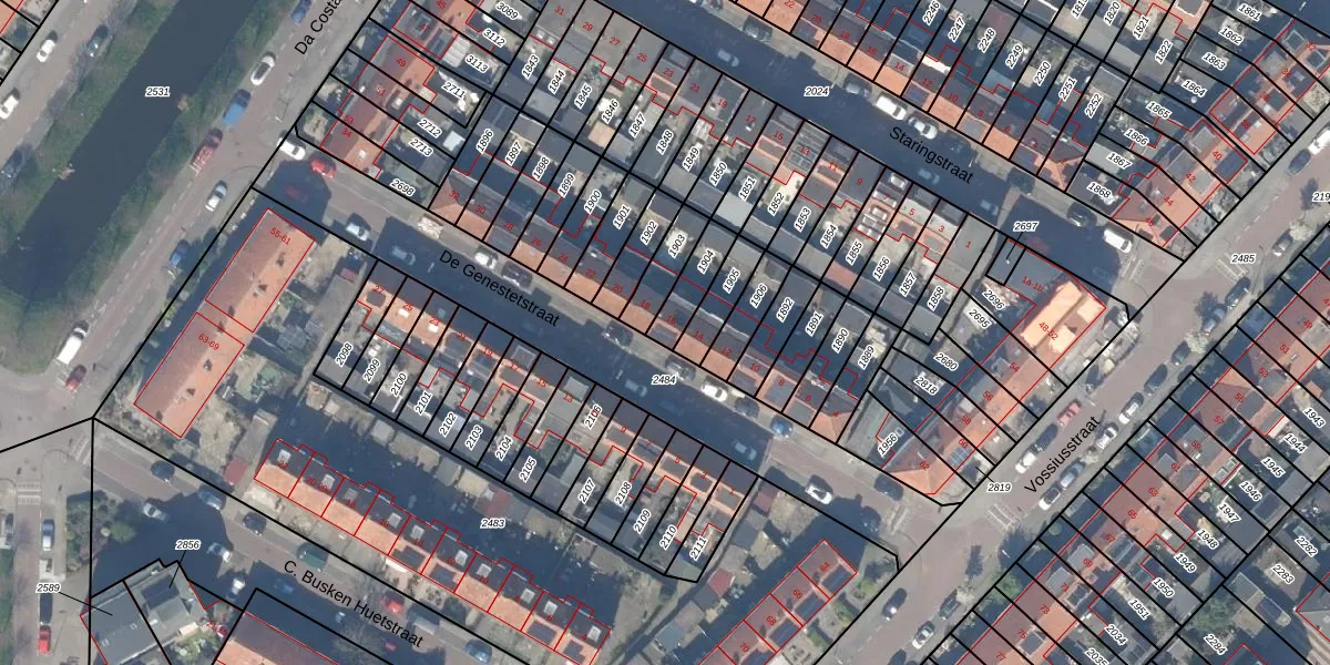 Het perceel waarop De Genestetstraat 16 staat heeft een oppervlakte van 94 m². Dit is een klein perceel. De perceeloppervlakte wordt geregistreerd door het Kadaster. Gedetailleerde informatie over de maten van dit perceel kunt u vinden in het rapport Kadastrale kaart met maatvoering van De Genestetstraat 16.