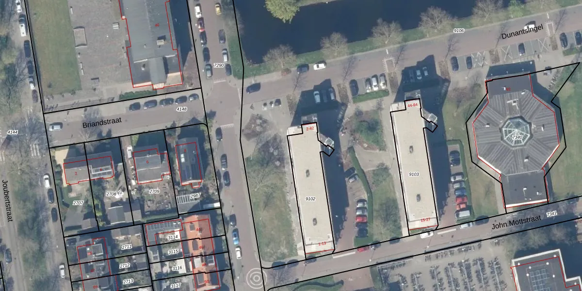 Dunantsingel 2 is gelegen op kadastraal perceel GDA01K9102. Deze kadastrale aanduiding is uniek en wordt gebruikt door het Kadaster om eigendomsrechten en andere zakelijke rechten vast te leggen. Het perceel maakt onderdeel uit van de kadastrale gemeente Gouda.