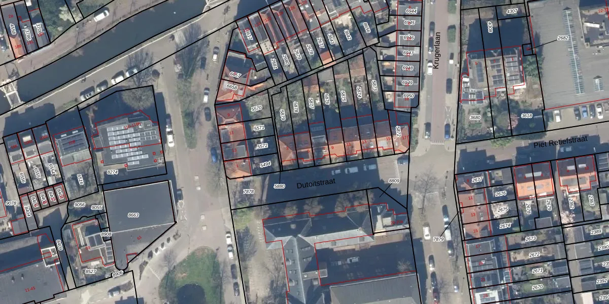 Dutoitstraat 5 is gelegen op kadastraal perceel GDA01A5878. Deze kadastrale aanduiding is uniek en wordt gebruikt door het Kadaster om eigendomsrechten en andere zakelijke rechten vast te leggen. Het perceel maakt onderdeel uit van de kadastrale gemeente Gouda.