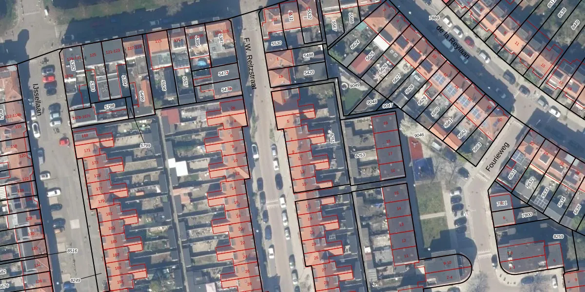 F.W. Reitzstraat 9 is gelegen op kadastraal perceel GDA01A8251. Deze kadastrale aanduiding is uniek en wordt gebruikt door het Kadaster om eigendomsrechten en andere zakelijke rechten vast te leggen. Het perceel maakt onderdeel uit van de kadastrale gemeente Gouda.
