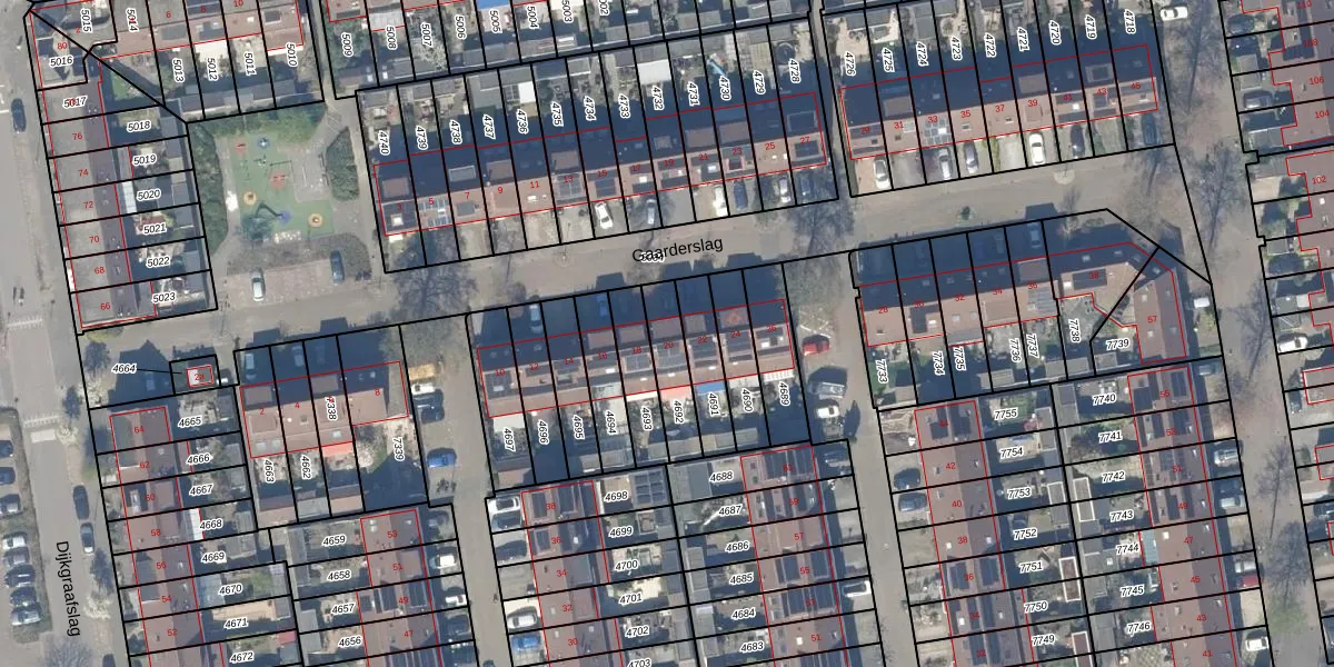 Gaarderslag 20 is gelegen op kadastraal perceel GDA01K4692. Deze kadastrale aanduiding is uniek en wordt gebruikt door het Kadaster om eigendomsrechten en andere zakelijke rechten vast te leggen. Het perceel maakt onderdeel uit van de kadastrale gemeente Gouda.