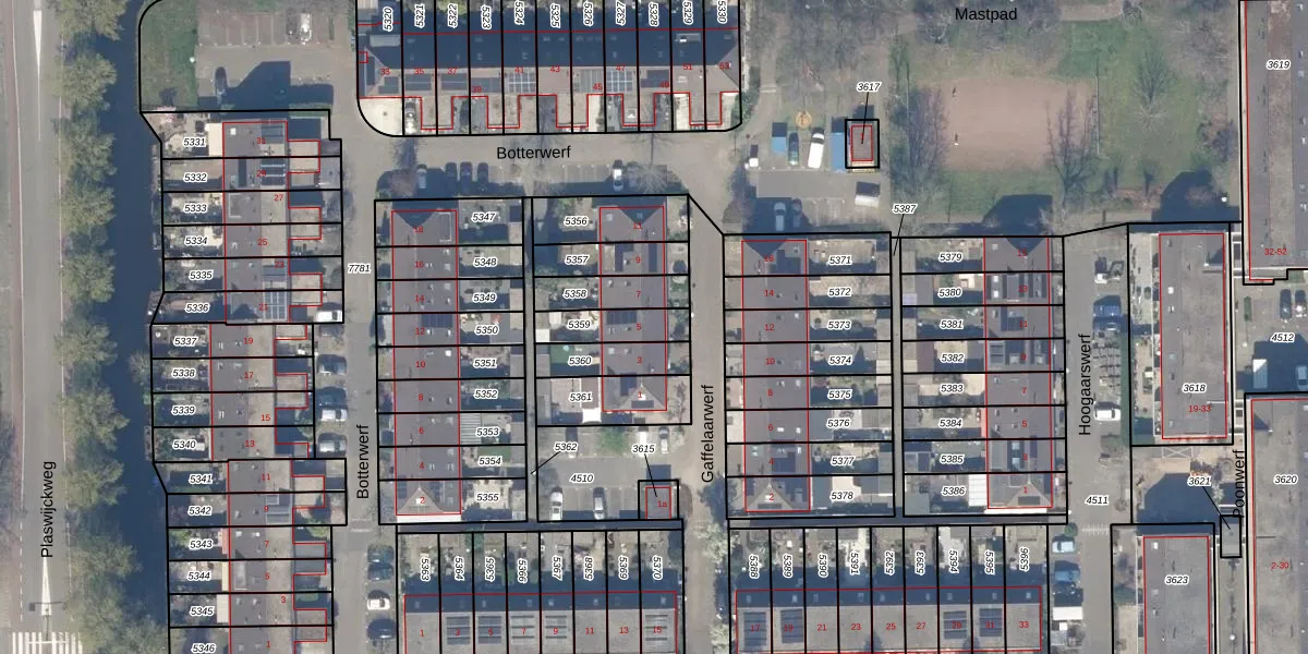 Het perceel waarop Gaffelaarwerf 5 staat heeft een oppervlakte van 121 m². Dit is een middelgroot perceel. De perceeloppervlakte wordt geregistreerd door het Kadaster. Gedetailleerde informatie over de maten van dit perceel kunt u vinden in het rapport Kadastrale kaart met maatvoering van Gaffelaarwerf 5.