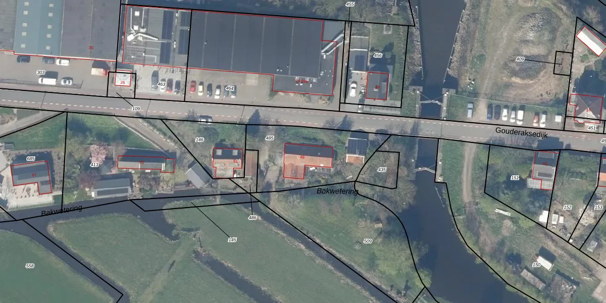 Gouderaksedijk 49 is gelegen op kadastraal perceel GDA01L485. Deze kadastrale aanduiding is uniek en wordt gebruikt door het Kadaster om eigendomsrechten en andere zakelijke rechten vast te leggen. Het perceel maakt onderdeel uit van de kadastrale gemeente Gouda.