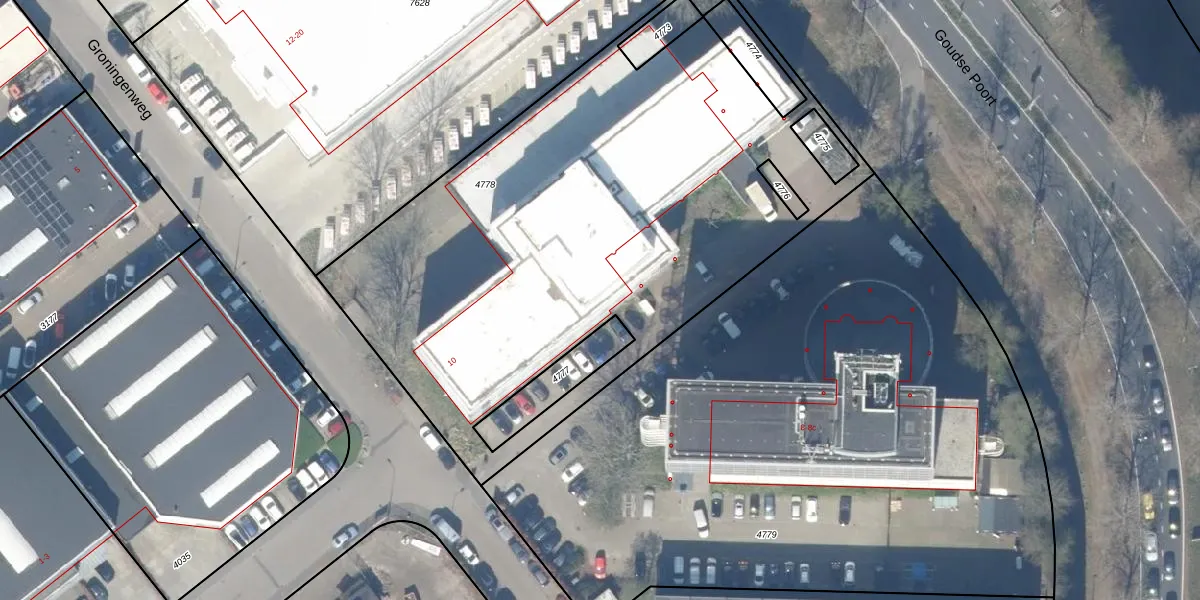 Groningenweg 10 is gelegen op kadastraal perceel GDA01M4778. Deze kadastrale aanduiding is uniek en wordt gebruikt door het Kadaster om eigendomsrechten en andere zakelijke rechten vast te leggen. Het perceel maakt onderdeel uit van de kadastrale gemeente Gouda.