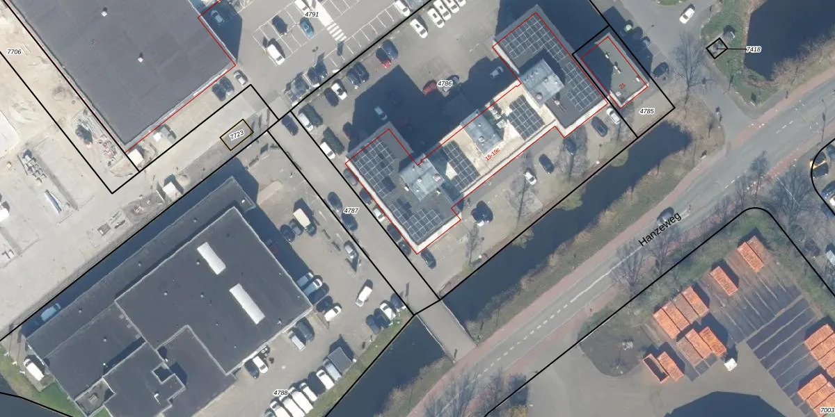 Het perceel waarop Hanzeweg 15-a staat heeft een oppervlakte van 3870 m². Dit is een zeer groot perceel. De perceeloppervlakte wordt geregistreerd door het Kadaster. Gedetailleerde informatie over de maten van dit perceel kunt u vinden in het rapport Kadastrale kaart met maatvoering van Hanzeweg 15-a.