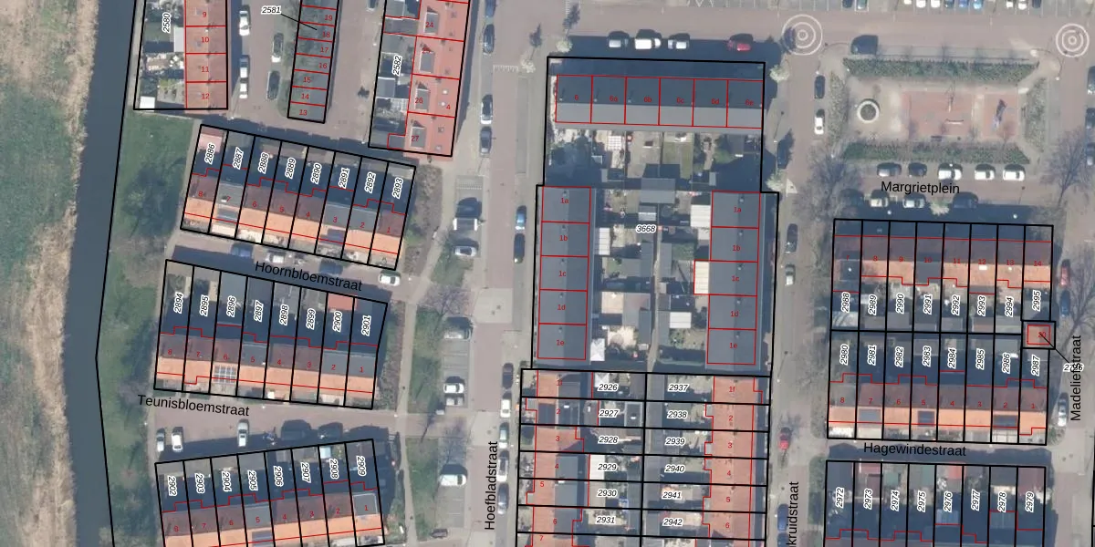 Het perceel waarop Hoefbladstraat 1-c staat heeft een oppervlakte van 2405 m². Dit is een zeer groot perceel. De perceeloppervlakte wordt geregistreerd door het Kadaster. Gedetailleerde informatie over de maten van dit perceel kunt u vinden in het rapport Kadastrale kaart met maatvoering van Hoefbladstraat 1-c.