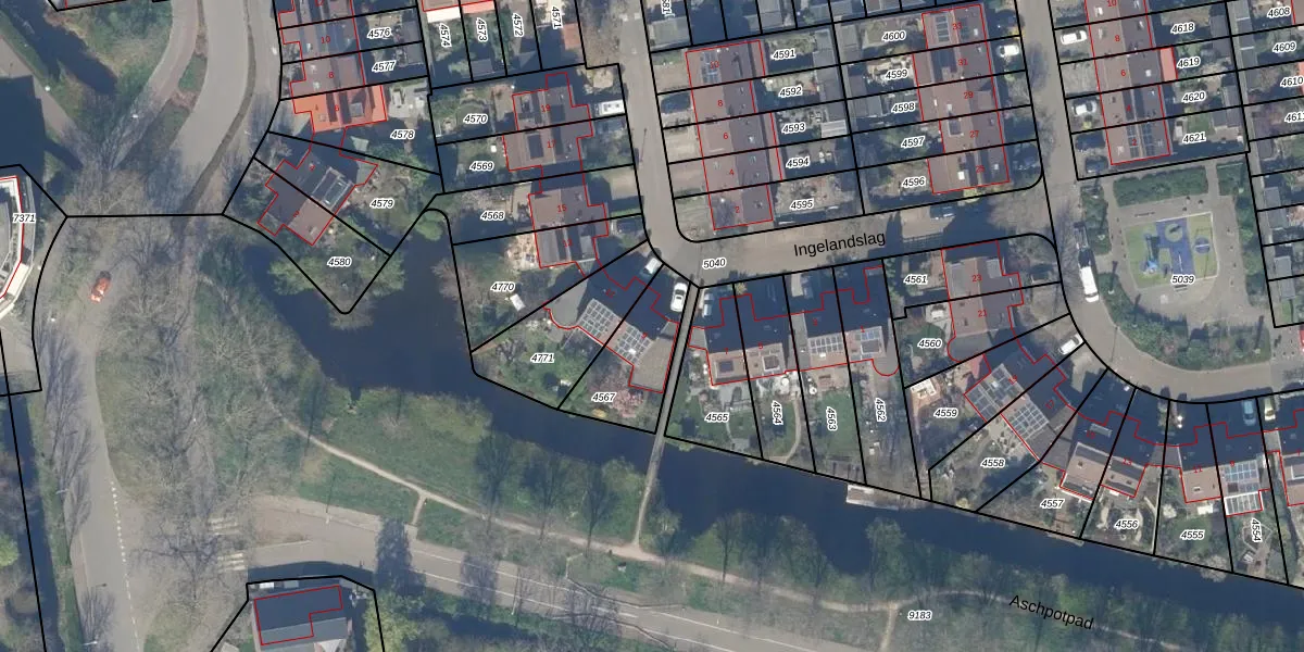 Ingelandslag 9 is gelegen op kadastraal perceel GDA01K4567. Deze kadastrale aanduiding is uniek en wordt gebruikt door het Kadaster om eigendomsrechten en andere zakelijke rechten vast te leggen. Het perceel maakt onderdeel uit van de kadastrale gemeente Gouda.