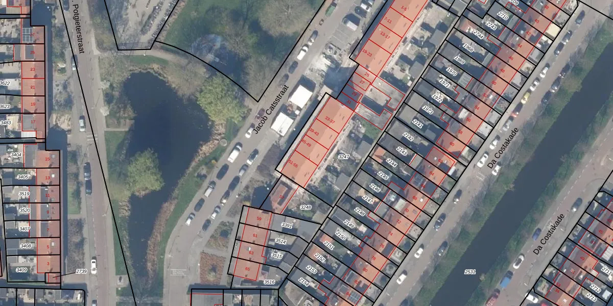 Jacob Catsstraat 47 is gelegen op kadastraal perceel GDA01F3247. Deze kadastrale aanduiding is uniek en wordt gebruikt door het Kadaster om eigendomsrechten en andere zakelijke rechten vast te leggen. Het perceel maakt onderdeel uit van de kadastrale gemeente Gouda.