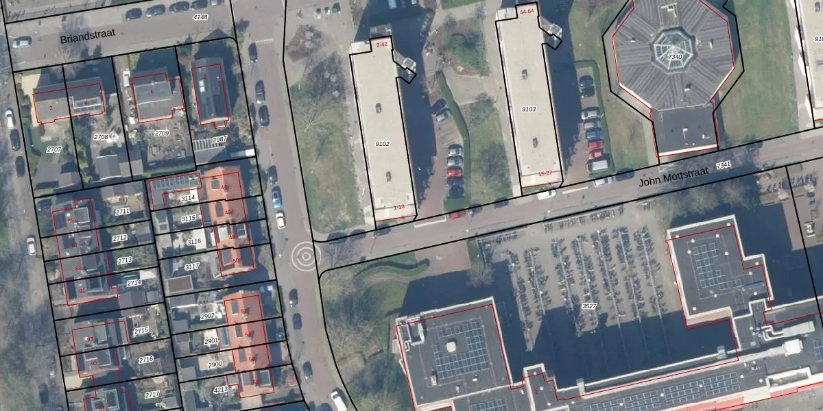 John Mottstraat 1 is gelegen op kadastraal perceel GDA01K9102. Deze kadastrale aanduiding is uniek en wordt gebruikt door het Kadaster om eigendomsrechten en andere zakelijke rechten vast te leggen. Het perceel maakt onderdeel uit van de kadastrale gemeente Gouda.