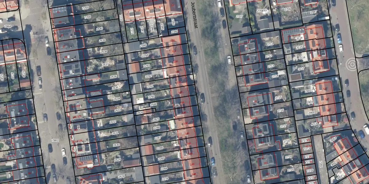 Het perceel waarop Joubertstraat 132 staat heeft een oppervlakte van 199 m². Dit is een middelgroot perceel. De perceeloppervlakte wordt geregistreerd door het Kadaster. Gedetailleerde informatie over de maten van dit perceel kunt u vinden in het rapport Kadastrale kaart met maatvoering van Joubertstraat 132.