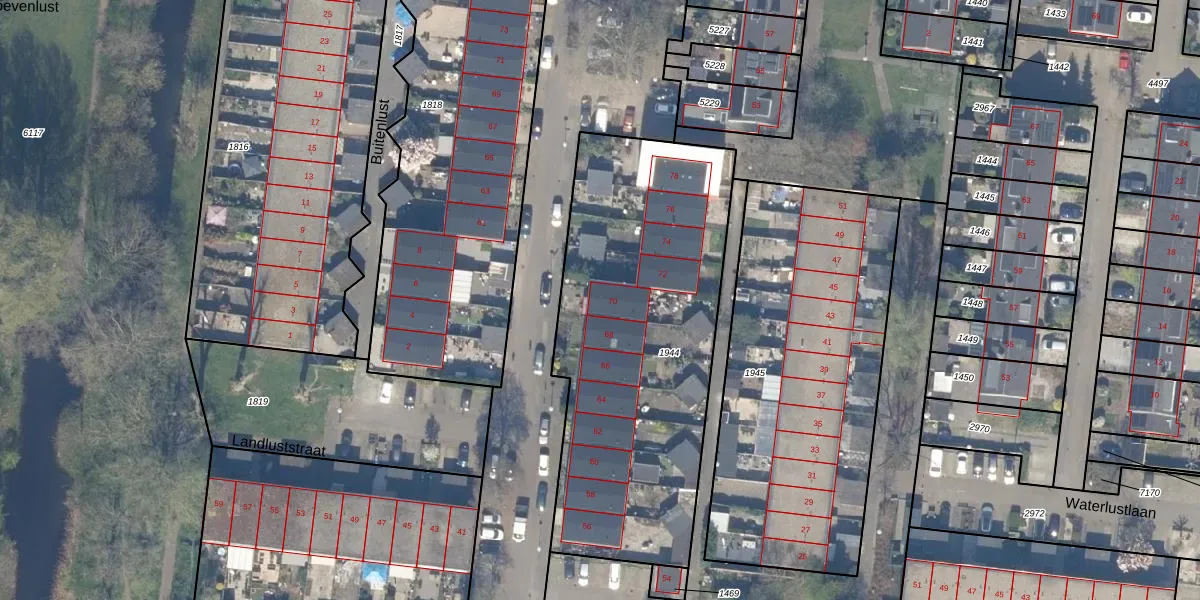 Het perceel waarop Landluststraat 70 staat heeft een oppervlakte van 1748 m². Dit is een zeer groot perceel. De perceeloppervlakte wordt geregistreerd door het Kadaster. Gedetailleerde informatie over de maten van dit perceel kunt u vinden in het rapport Kadastrale kaart met maatvoering van Landluststraat 70.