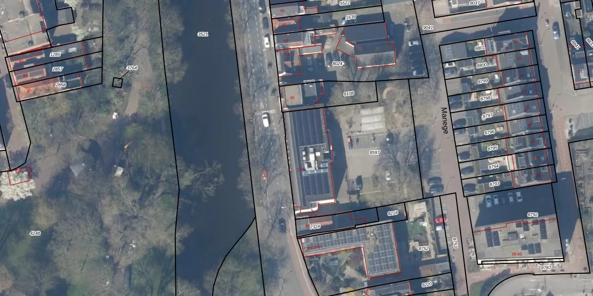 Het perceel waarop Manege 27 staat heeft een oppervlakte van 1633 m². Dit is een zeer groot perceel. De perceeloppervlakte wordt geregistreerd door het Kadaster. Gedetailleerde informatie over de maten van dit perceel kunt u vinden in het rapport Kadastrale kaart met maatvoering van Manege 27.