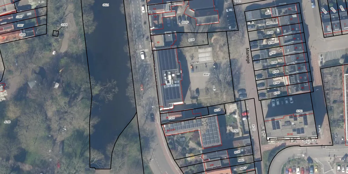 Het perceel waarop Manege 35 staat heeft een oppervlakte van 1633 m². Dit is een zeer groot perceel. De perceeloppervlakte wordt geregistreerd door het Kadaster. Gedetailleerde informatie over de maten van dit perceel kunt u vinden in het rapport Kadastrale kaart met maatvoering van Manege 35.