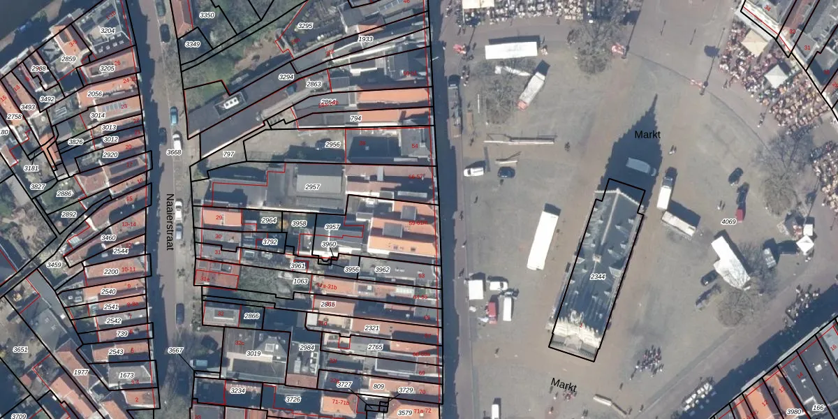 Het perceel waarop Markt 59 staat heeft een oppervlakte van 407 m². Dit is een groot perceel. De perceeloppervlakte wordt geregistreerd door het Kadaster. Gedetailleerde informatie over de maten van dit perceel kunt u vinden in het rapport Kadastrale kaart met maatvoering van Markt 59.