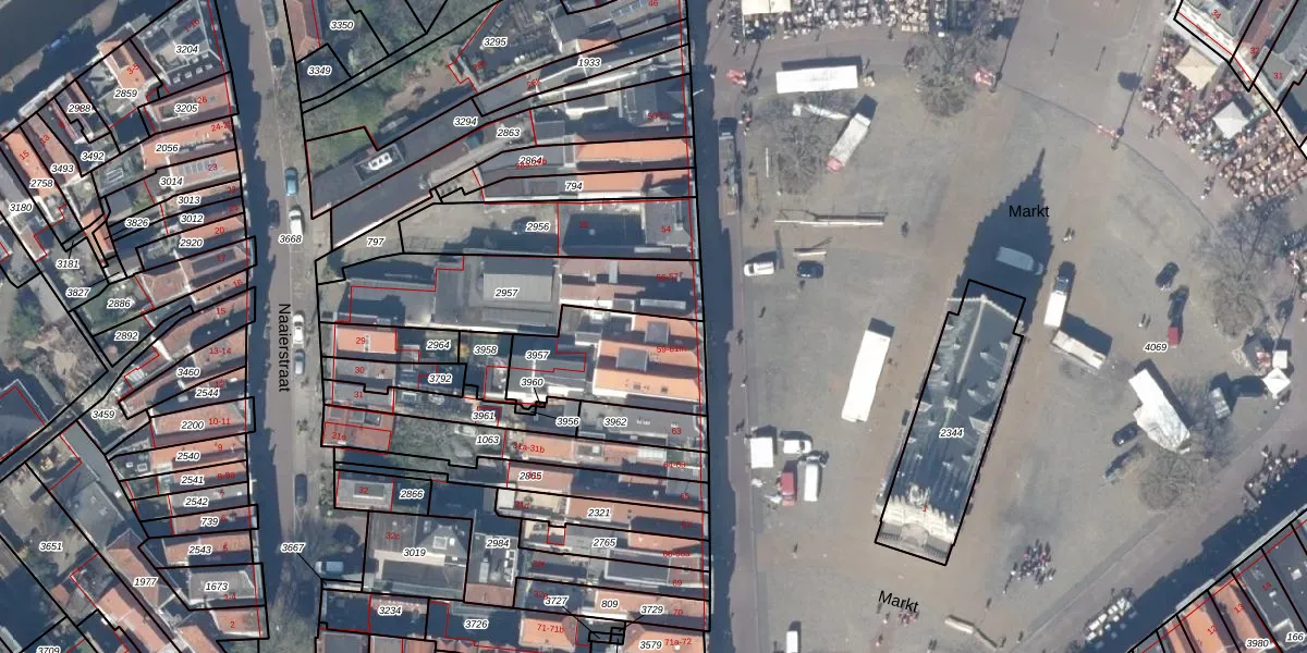 Het perceel waarop Markt 59-a staat heeft een oppervlakte van 407 m². Dit is een groot perceel. De perceeloppervlakte wordt geregistreerd door het Kadaster. Gedetailleerde informatie over de maten van dit perceel kunt u vinden in het rapport Kadastrale kaart met maatvoering van Markt 59-a.