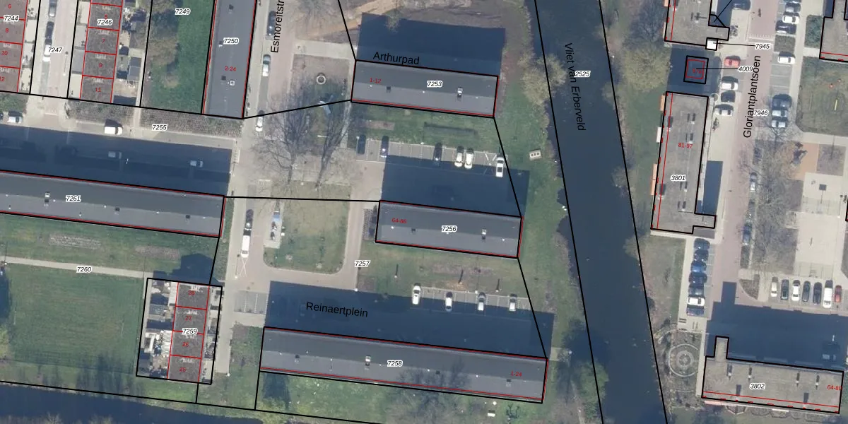 Het perceel waarop Merlijnstraat 66 staat heeft een oppervlakte van 334 m². Dit is een groot perceel. De perceeloppervlakte wordt geregistreerd door het Kadaster. Gedetailleerde informatie over de maten van dit perceel kunt u vinden in het rapport Kadastrale kaart met maatvoering van Merlijnstraat 66.