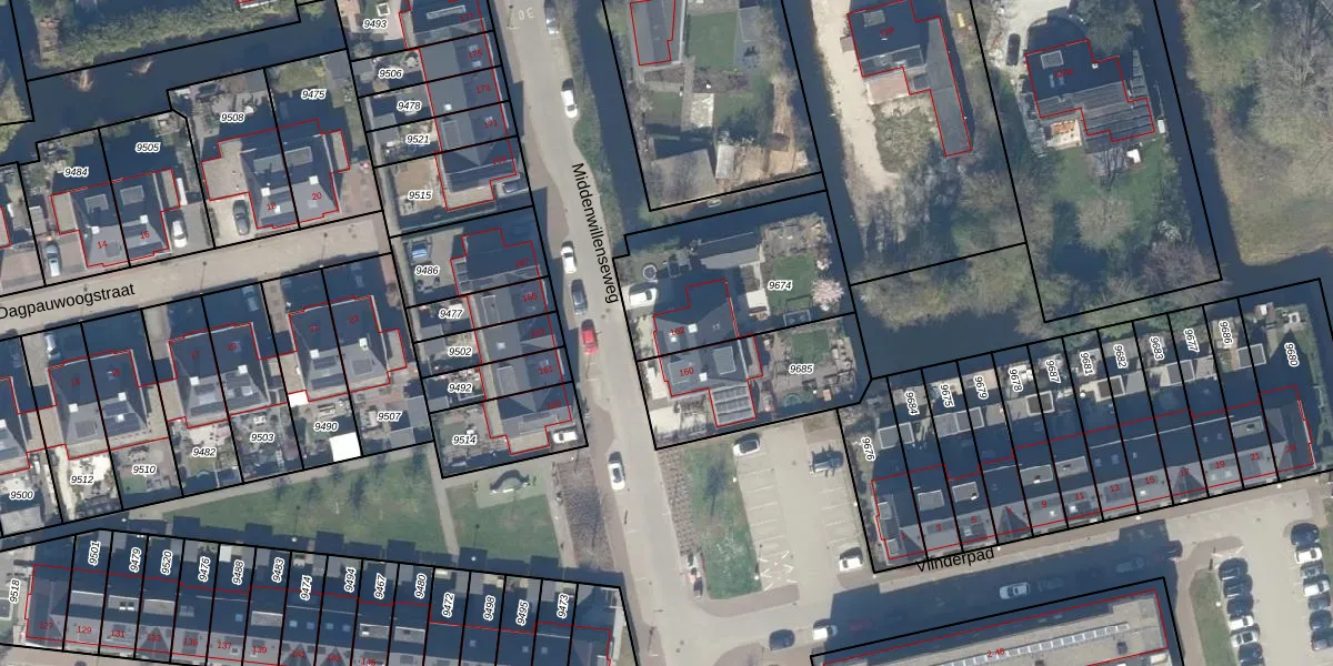 Middenwillenseweg 162 is gelegen op kadastraal perceel GDA01K9674. Deze kadastrale aanduiding is uniek en wordt gebruikt door het Kadaster om eigendomsrechten en andere zakelijke rechten vast te leggen. Het perceel maakt onderdeel uit van de kadastrale gemeente Gouda.