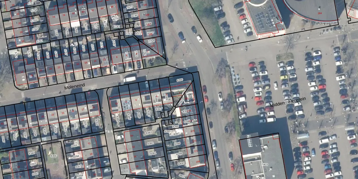 Moleneind 1 is gelegen op kadastraal perceel GDA01K8390. Deze kadastrale aanduiding is uniek en wordt gebruikt door het Kadaster om eigendomsrechten en andere zakelijke rechten vast te leggen. Het perceel maakt onderdeel uit van de kadastrale gemeente Gouda.