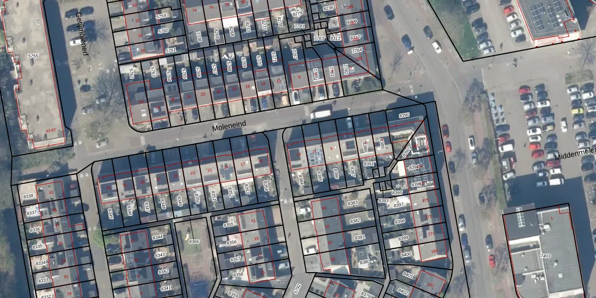 Moleneind 13 is gelegen op kadastraal perceel GDA01K8384. Deze kadastrale aanduiding is uniek en wordt gebruikt door het Kadaster om eigendomsrechten en andere zakelijke rechten vast te leggen. Het perceel maakt onderdeel uit van de kadastrale gemeente Gouda.