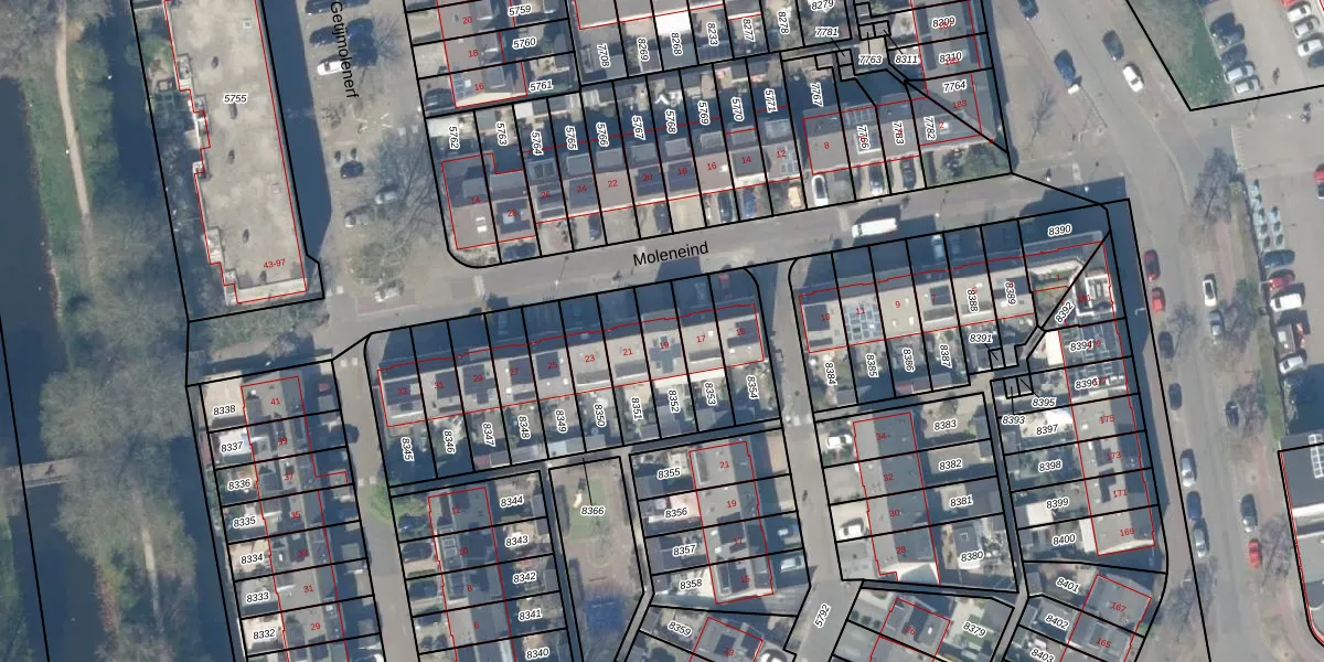 Moleneind 19 is gelegen op kadastraal perceel GDA01K8352. Deze kadastrale aanduiding is uniek en wordt gebruikt door het Kadaster om eigendomsrechten en andere zakelijke rechten vast te leggen. Het perceel maakt onderdeel uit van de kadastrale gemeente Gouda.