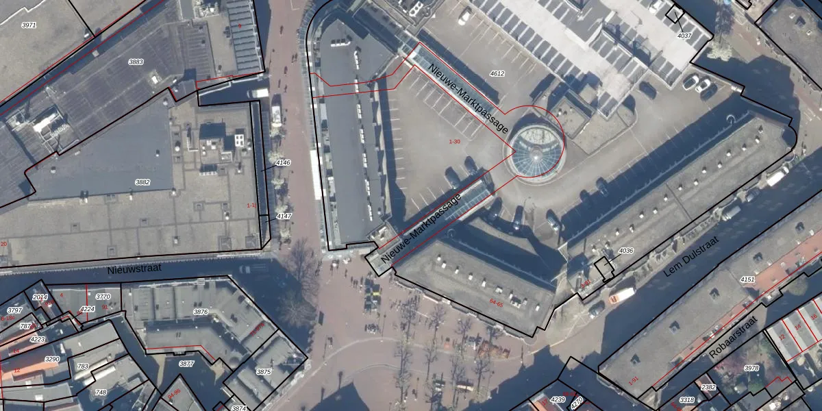 Het perceel waarop Nieuwe-Marktpassage 5 staat heeft een oppervlakte van 9736 m². Dit is een zeer groot perceel. De perceeloppervlakte wordt geregistreerd door het Kadaster. Gedetailleerde informatie over de maten van dit perceel kunt u vinden in het rapport Kadastrale kaart met maatvoering van Nieuwe-Marktpassage 5.