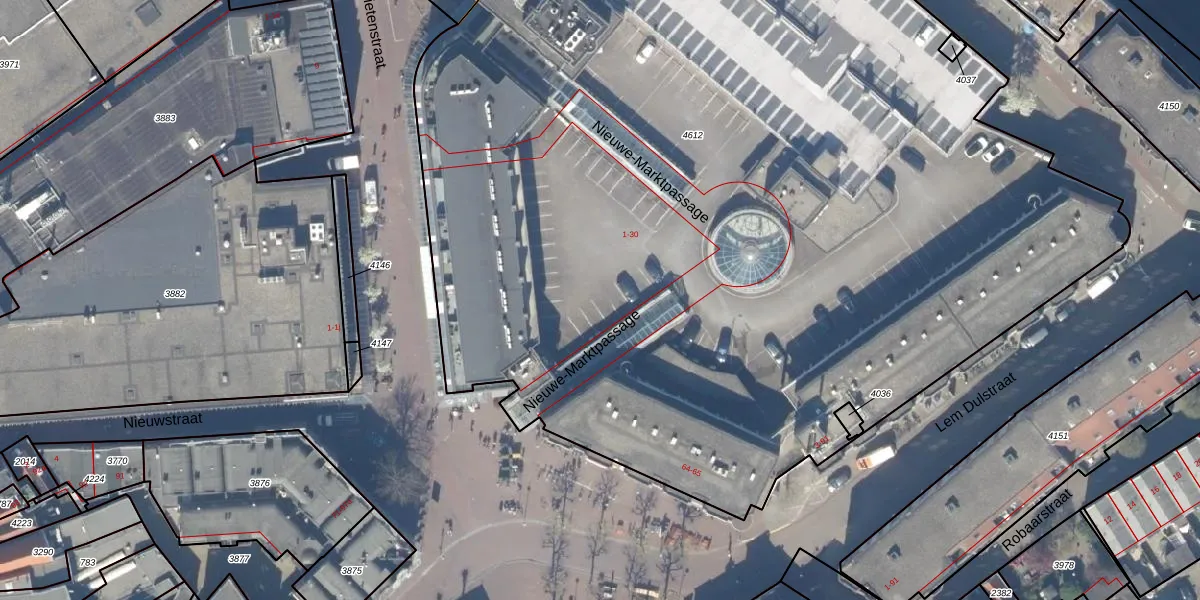 Het perceel waarop Nieuwe-Marktpassage 7 staat heeft een oppervlakte van 9736 m². Dit is een zeer groot perceel. De perceeloppervlakte wordt geregistreerd door het Kadaster. Gedetailleerde informatie over de maten van dit perceel kunt u vinden in het rapport Kadastrale kaart met maatvoering van Nieuwe-Marktpassage 7.