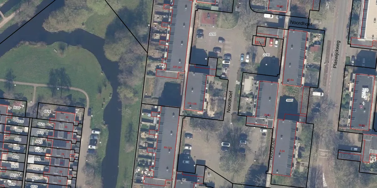 Het perceel waarop Noordhoef 125 staat heeft een oppervlakte van 2874 m². Dit is een zeer groot perceel. De perceeloppervlakte wordt geregistreerd door het Kadaster. Gedetailleerde informatie over de maten van dit perceel kunt u vinden in het rapport Kadastrale kaart met maatvoering van Noordhoef 125.