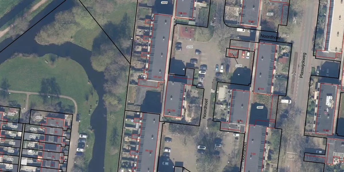 Het perceel waarop Noordhoef 135 staat heeft een oppervlakte van 2874 m². Dit is een zeer groot perceel. De perceeloppervlakte wordt geregistreerd door het Kadaster. Gedetailleerde informatie over de maten van dit perceel kunt u vinden in het rapport Kadastrale kaart met maatvoering van Noordhoef 135.