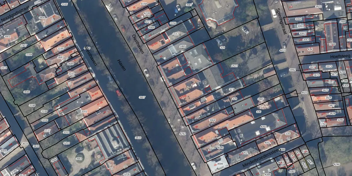 Het perceel waarop Oosthaven 53 staat heeft een oppervlakte van 770 m². Dit is een groot perceel. De perceeloppervlakte wordt geregistreerd door het Kadaster. Gedetailleerde informatie over de maten van dit perceel kunt u vinden in het rapport Kadastrale kaart met maatvoering van Oosthaven 53.