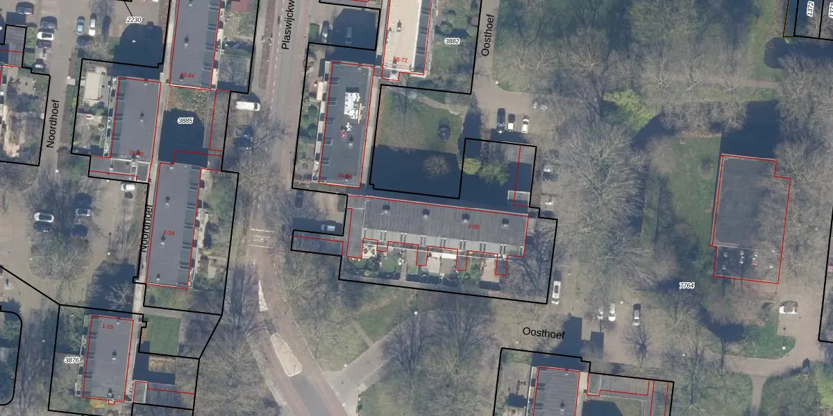 Het perceel waarop Oosthoef 22 staat heeft een oppervlakte van 3796 m². Dit is een zeer groot perceel. De perceeloppervlakte wordt geregistreerd door het Kadaster. Gedetailleerde informatie over de maten van dit perceel kunt u vinden in het rapport Kadastrale kaart met maatvoering van Oosthoef 22.
