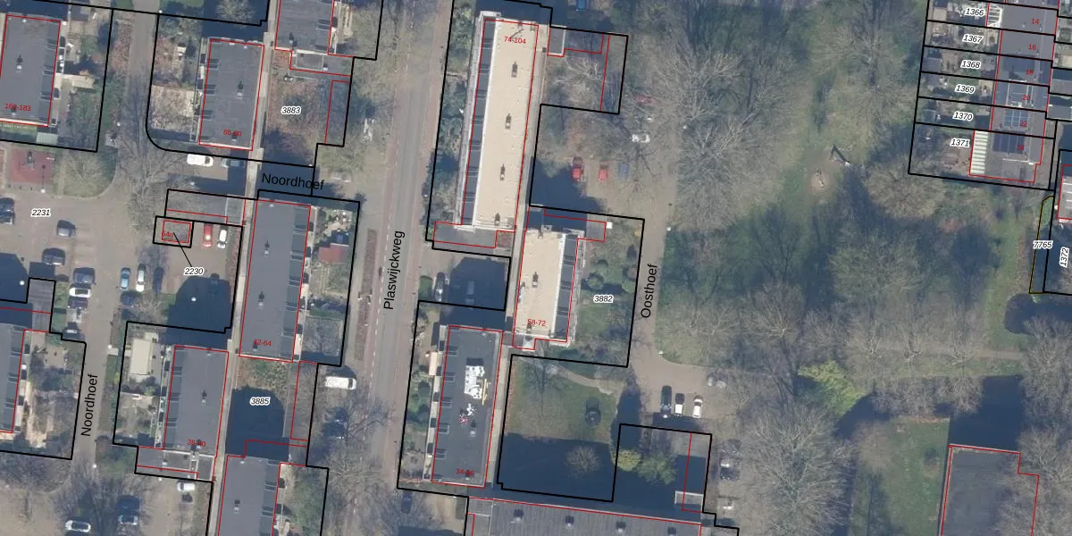 Het perceel waarop Oosthoef 68 staat heeft een oppervlakte van 3796 m². Dit is een zeer groot perceel. De perceeloppervlakte wordt geregistreerd door het Kadaster. Gedetailleerde informatie over de maten van dit perceel kunt u vinden in het rapport Kadastrale kaart met maatvoering van Oosthoef 68.