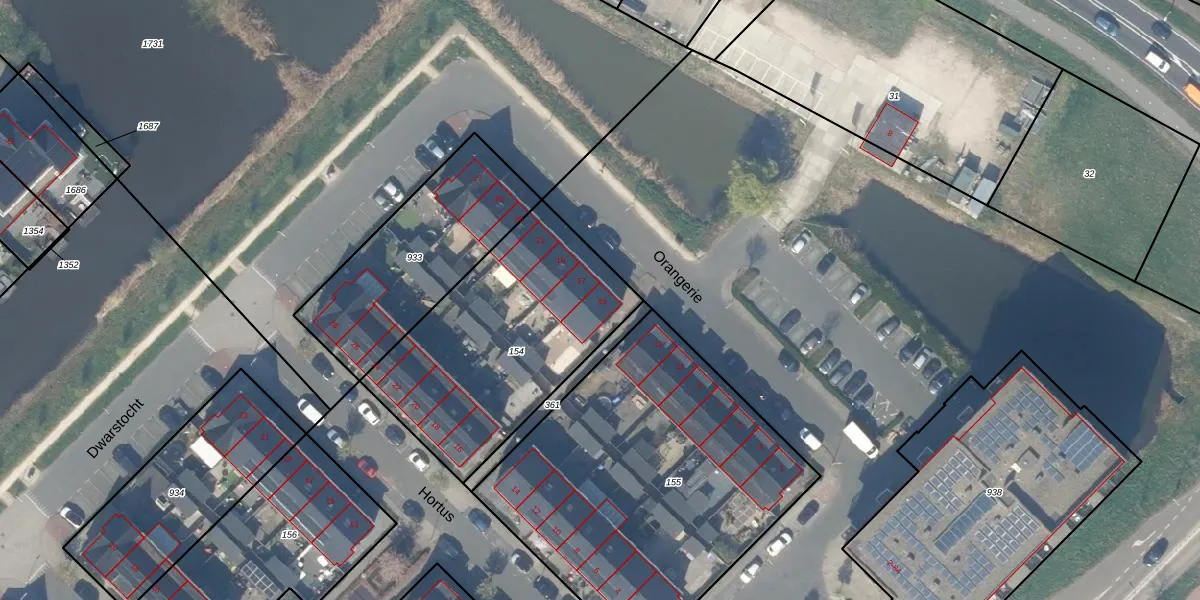 Het perceel waarop Orangerie 15 staat heeft een oppervlakte van 1030 m². Dit is een zeer groot perceel. De perceeloppervlakte wordt geregistreerd door het Kadaster. Gedetailleerde informatie over de maten van dit perceel kunt u vinden in het rapport Kadastrale kaart met maatvoering van Orangerie 15.