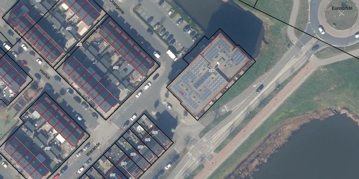 Het perceel waarop Orangerie 42 staat heeft een oppervlakte van 1250 m². Dit is een zeer groot perceel. De perceeloppervlakte wordt geregistreerd door het Kadaster. Gedetailleerde informatie over de maten van dit perceel kunt u vinden in het rapport Kadastrale kaart met maatvoering van Orangerie 42.