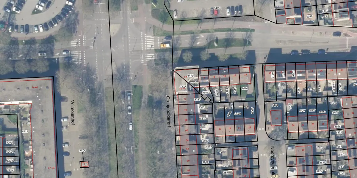 Oranjepoldererf 74 is gelegen op kadastraal perceel GDA01K6472. Deze kadastrale aanduiding is uniek en wordt gebruikt door het Kadaster om eigendomsrechten en andere zakelijke rechten vast te leggen. Het perceel maakt onderdeel uit van de kadastrale gemeente Gouda.