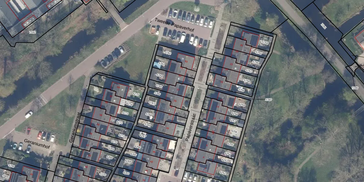 Papaverstraat 57 is gelegen op kadastraal perceel GDA01M5765. Deze kadastrale aanduiding is uniek en wordt gebruikt door het Kadaster om eigendomsrechten en andere zakelijke rechten vast te leggen. Het perceel maakt onderdeel uit van de kadastrale gemeente Gouda.
