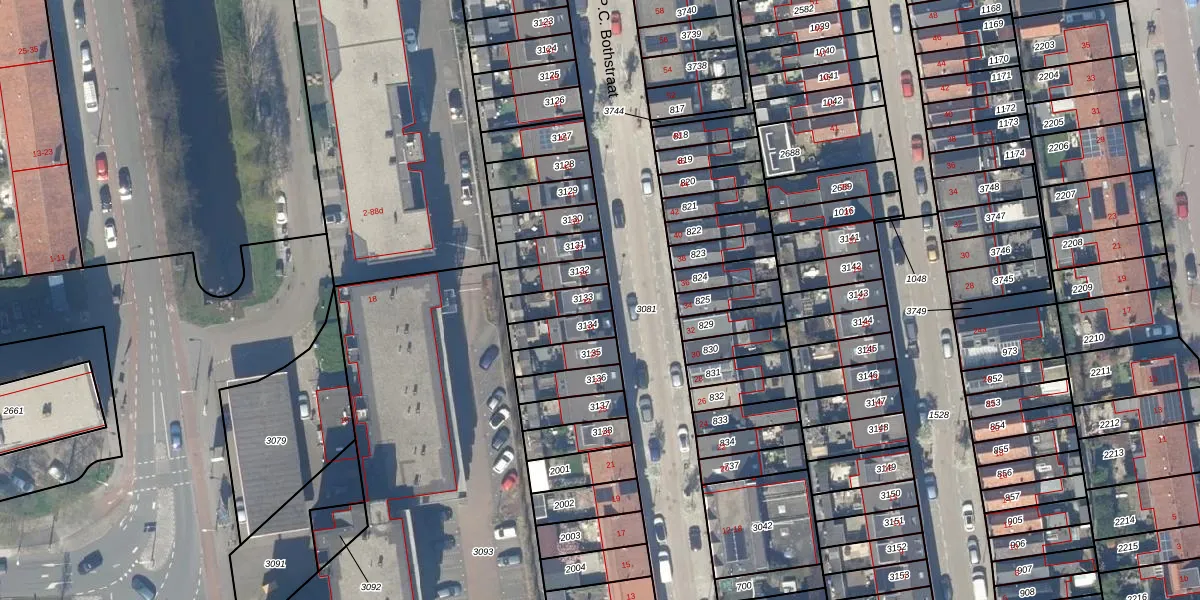 Het perceel waarop P.C. Bothstraat 33 staat heeft een oppervlakte van 77 m². Dit is een klein perceel. De perceeloppervlakte wordt geregistreerd door het Kadaster. Gedetailleerde informatie over de maten van dit perceel kunt u vinden in het rapport Kadastrale kaart met maatvoering van P.C. Bothstraat 33.
