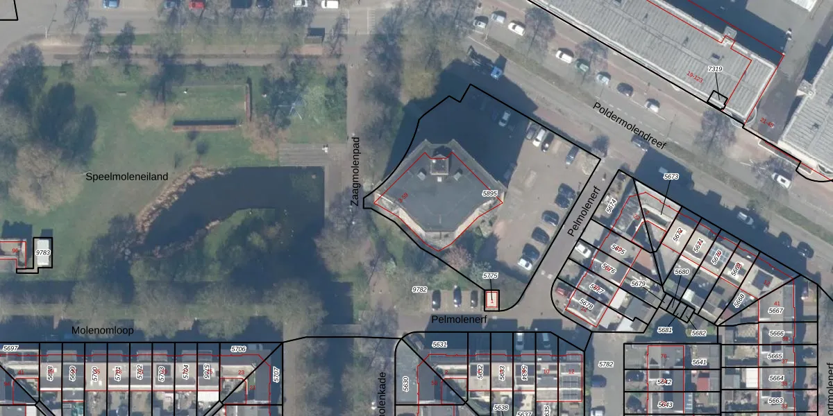 Pelmolenerf 53 is gelegen op kadastraal perceel GDA01K5895. Deze kadastrale aanduiding is uniek en wordt gebruikt door het Kadaster om eigendomsrechten en andere zakelijke rechten vast te leggen. Het perceel maakt onderdeel uit van de kadastrale gemeente Gouda.