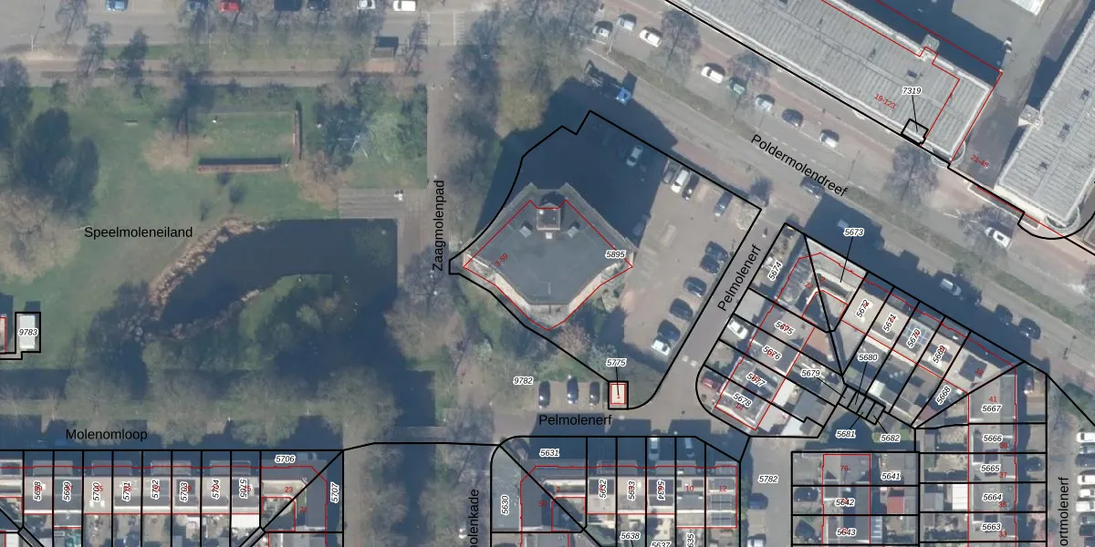 Pelmolenerf 55 is gelegen op kadastraal perceel GDA01K5895. Deze kadastrale aanduiding is uniek en wordt gebruikt door het Kadaster om eigendomsrechten en andere zakelijke rechten vast te leggen. Het perceel maakt onderdeel uit van de kadastrale gemeente Gouda.