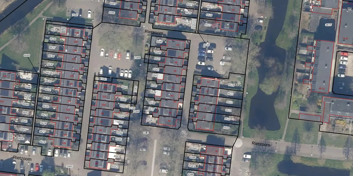 Rietzoom 42 is gelegen op kadastraal perceel GDA01M6540. Deze kadastrale aanduiding is uniek en wordt gebruikt door het Kadaster om eigendomsrechten en andere zakelijke rechten vast te leggen. Het perceel maakt onderdeel uit van de kadastrale gemeente Gouda.