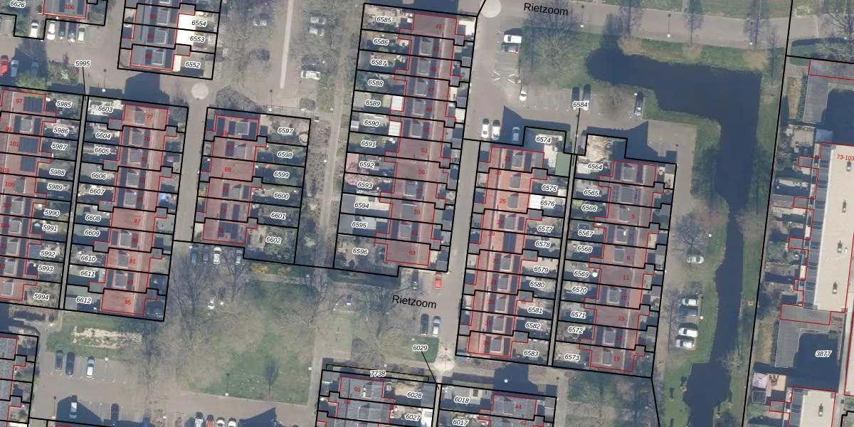 Rietzoom 59 is gelegen op kadastraal perceel GDA01M6594. Deze kadastrale aanduiding is uniek en wordt gebruikt door het Kadaster om eigendomsrechten en andere zakelijke rechten vast te leggen. Het perceel maakt onderdeel uit van de kadastrale gemeente Gouda.