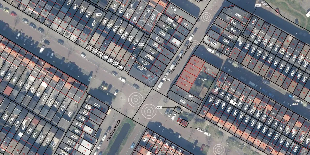Roemer Visscherstraat 20 is gelegen op kadastraal perceel GDA01E3089. Deze kadastrale aanduiding is uniek en wordt gebruikt door het Kadaster om eigendomsrechten en andere zakelijke rechten vast te leggen. Het perceel maakt onderdeel uit van de kadastrale gemeente Gouda.