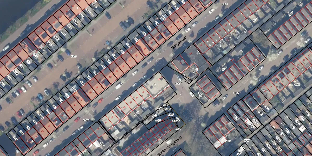 Snoystraat 41 is gelegen op kadastraal perceel GDA01E5865. Deze kadastrale aanduiding is uniek en wordt gebruikt door het Kadaster om eigendomsrechten en andere zakelijke rechten vast te leggen. Het perceel maakt onderdeel uit van de kadastrale gemeente Gouda.