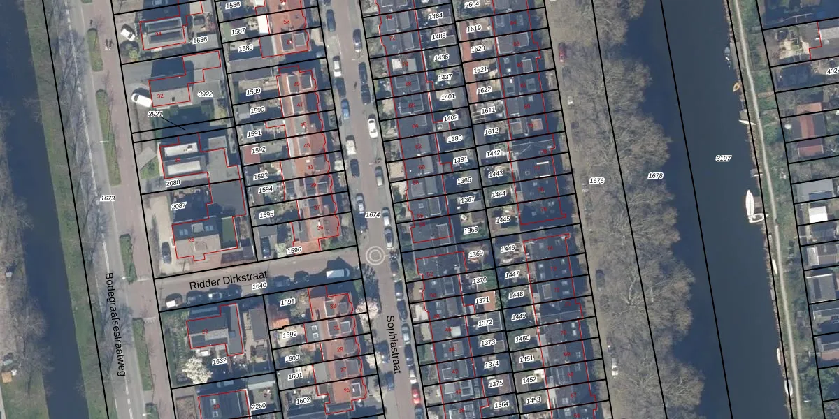 Sophiastraat 56 is gelegen op kadastraal perceel GDA01I1367. Deze kadastrale aanduiding is uniek en wordt gebruikt door het Kadaster om eigendomsrechten en andere zakelijke rechten vast te leggen. Het perceel maakt onderdeel uit van de kadastrale gemeente Gouda.