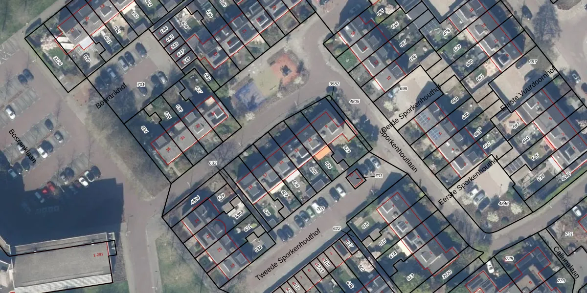 Sporkenhoutlaan 13 is gelegen op kadastraal perceel GDA01M625. Deze kadastrale aanduiding is uniek en wordt gebruikt door het Kadaster om eigendomsrechten en andere zakelijke rechten vast te leggen. Het perceel maakt onderdeel uit van de kadastrale gemeente Gouda.