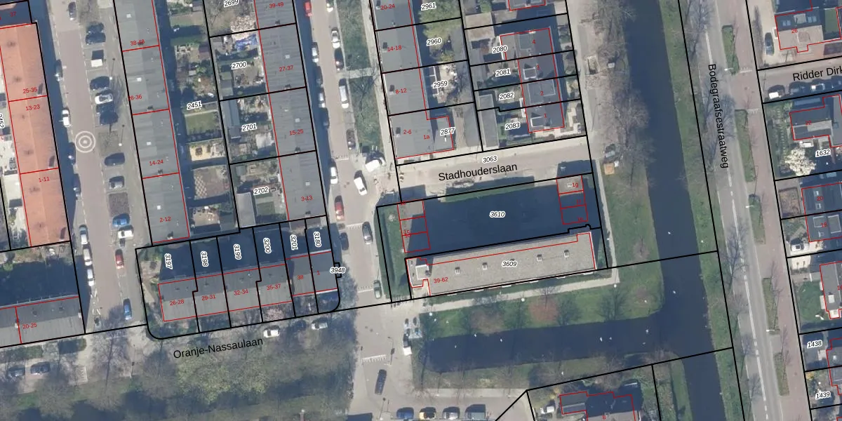 Stadhouderslaan 1-b is gelegen op kadastraal perceel GDA01I3610. Deze kadastrale aanduiding is uniek en wordt gebruikt door het Kadaster om eigendomsrechten en andere zakelijke rechten vast te leggen. Het perceel maakt onderdeel uit van de kadastrale gemeente Gouda.