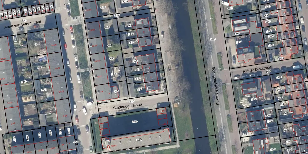 Stadhouderslaan 2 is gelegen op kadastraal perceel GDA01I2082. Deze kadastrale aanduiding is uniek en wordt gebruikt door het Kadaster om eigendomsrechten en andere zakelijke rechten vast te leggen. Het perceel maakt onderdeel uit van de kadastrale gemeente Gouda.